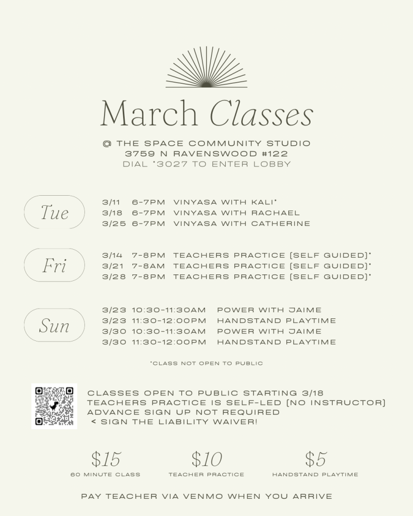 My schedule is changing! Starting March 23, I will be teaching at The Space Community Studio in Ravenswood on Sundays at 10:30am. We’ll do an hour of Power Yoga followed by 30 minutes of Handstand Conditioning – you can stay for both, or leave after Power is over! Class is $15 and Handstands are an additional $5 – if payment is a challenge, just send me a note and we’ll find a way.