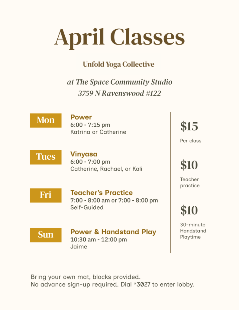 | Tues | 4/8/2025 | 6-7pm | Vinyasa Yoga | Catherine Zedell | $15 |